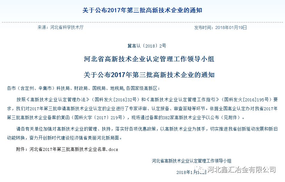 2018年1月19日,經(jīng)河北省高新技術(shù)企業(yè)認(rèn)定管理辦公室組織專家評審、公示等程序后,我公司順利通過國家高新技術(shù)企業(yè)認(rèn)定,成為高新技術(shù)企業(yè)。